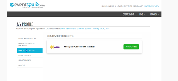To access your Eventsquid account and view your Event Registrations, update your Profile, and see your Event Uploads please click the Attendee Login button above or go to www.eventsquid.com and login with your email and password. To access your information, click your name in the upper right-hand corner and choose My Account. Please note that you may see a record of Education Credits, but these are no longer being updated since certificates are created with the process outlined above.